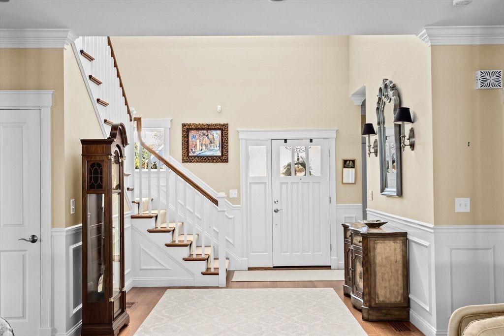 Easy Living! This pristine home blends luxury and convenience and is nestled on a quiet cul-de-sac in the highly desirable Weathervane in the Chestnut Gardens neighborhood. This condo alternative features an inviting foyer with soaring ceilings and sun-filled spaces with beautiful millwork throughout. The spacious living room with a cozy fireplace and custom built-ins flows into a sun-drenched den with a spectacular wall of windows overlooking the backyard oasis. A formal dining room is perfect for entertaining, and the light-filled chef’s kitchen boasts high-end appliances, a large center island, and a charming window seat. The sought-after first-floor primary suite offers a large walk-in closet and luxurious full bath. Upstairs are two bedrooms, a full bath, and a flexible bonus room ideal for an office, gym, or playroom. Outside, enjoy a stone patio and pergola—all just minutes from the Hingham Shipyard, commuter boat, train, shopping, and dining