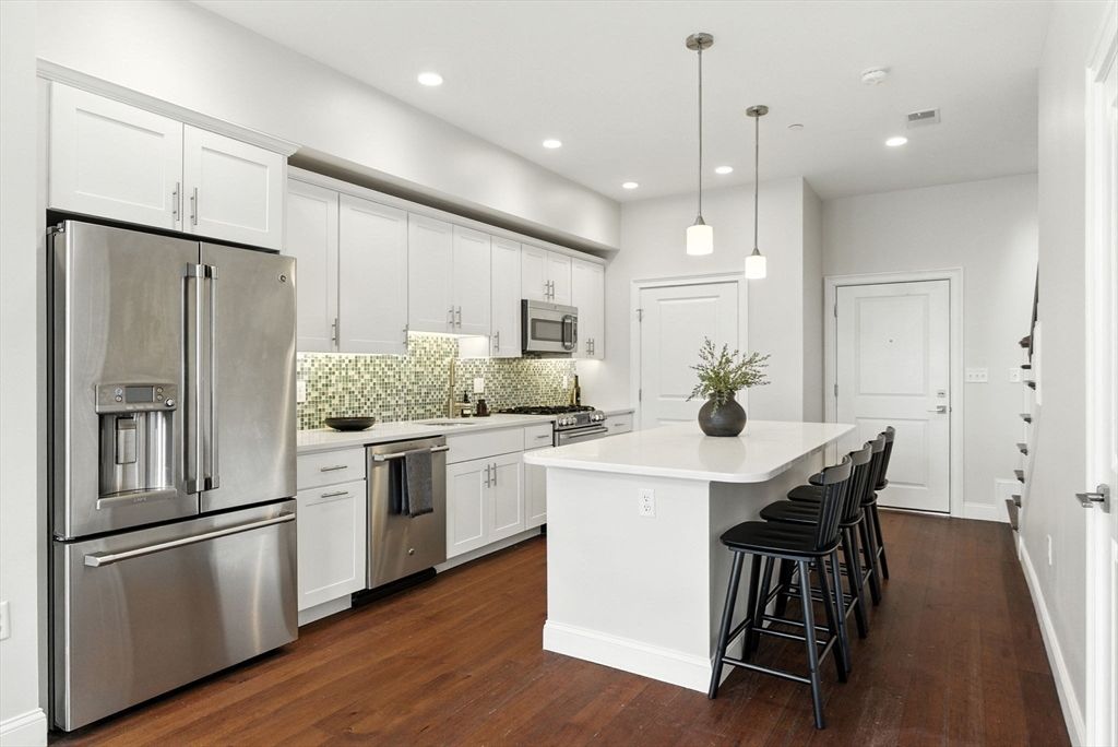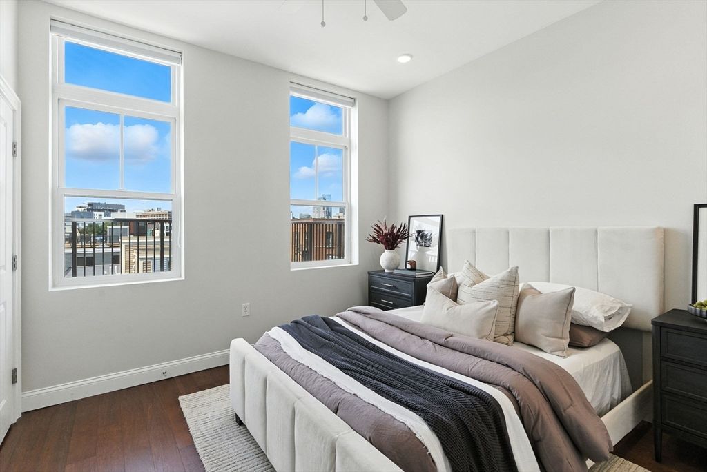 Absolute stunning, duplex-style PENTHOUSE, 2Bed 2.5Bath w/DEEDED GARAGE PARKING + PRIVATE ROOF DECK w/gas connection for grilling! This unit is an entertainer's dream and lives like a true home in South Boston's most desirable location. The main living area offers an open floor plan with an excellent layout. There is a large kitchen with 4-seat island that opens to a spacious dining area equipped with a stylish dry bar. The dining area seamlessly flows into the large, corner exposure living room. Find a 1/2 bath & laundry on this level, which also has oversized windows & towering ceilings offering amazing natural light. Head upstairs to find two large bedrooms, including a primary with an ensuite bath, a second full bath, and a versatile bonus room great for work from home use or a play / entertainment area. This is also where you access your private roof deck with sweeping views of the city. Professionally managed, Pet-Friendly, Elevator Building, 2017 Construction. EASY TO SHOW!