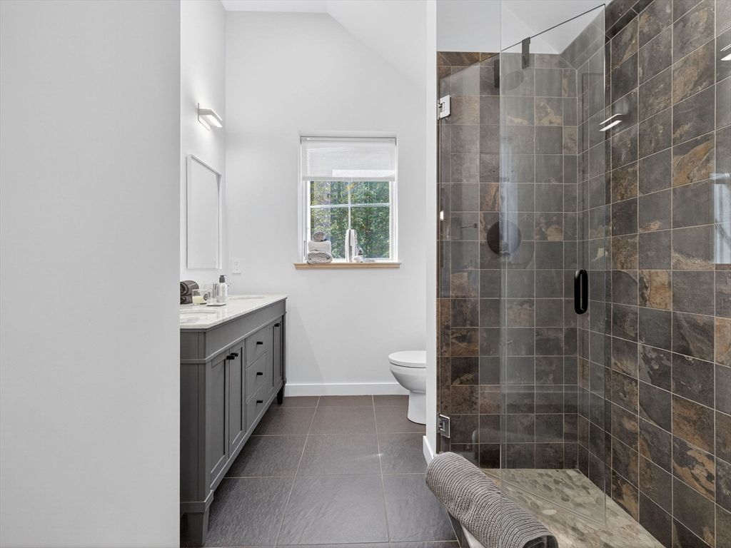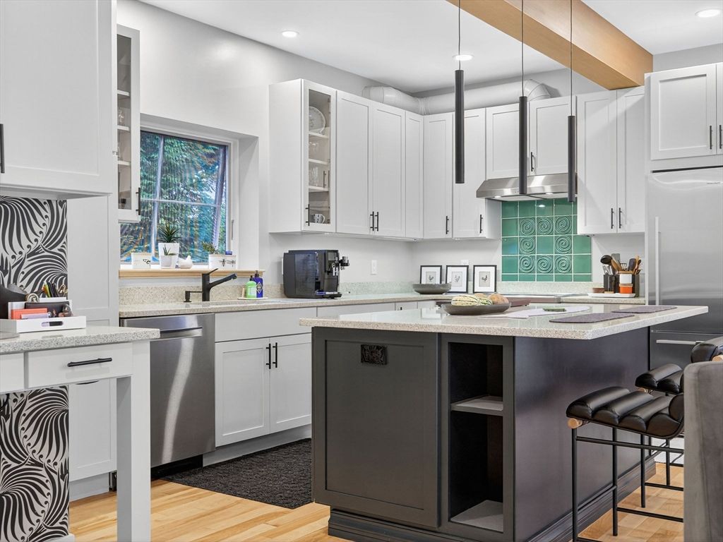 Stunning modern farmhouse designed by A3 Architects as a sublime retreat for a family of 5. Built in 2014 & barely visible from the street, the home’s East-West axis maximizes southern exposure for 28 owned solar panels & main rooms sit along south facade to receive maximum passive solar gain. Super insulated 12” exterior walls reduce H/C needs & add interior quiet. Open concept main living/dining features large Marvin windows & 1st floor primary suite w/ spa-like bathroom & private patio. Upstairs, find 3 large bedrooms, a full bath & flexible homework/TV/workout area. Hardie board exteriors. Large 1.36 acre lot, wired for Husqvarna automower, features a treehouse, fenced garden w/ 6 raised Vego beds, shed, & drip irrigation for unique & mature trees, grape arbor & pollinator-friendly plantings. Meticulous premium upgrades, new full-house H20 filtration system & Miele W/D, complete this serene, nature-friendly family oasis. Short distance to commuter-rail/short drive to Ferry.