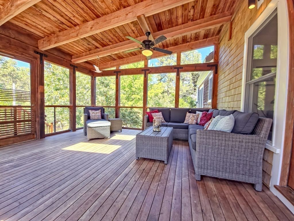 Set in the quiet Seabrook Pines neighborhood, this Cape Cod home pairs thoughtful updates with a classic layout. The kitchen features a Wolf induction range and hood, a new French-door refrigerator, a beverage fridge, and custom pull-out cabinetry. An adjoining prep area has an open-air pantry with shelving and a second sink. The dining area opens to a living room with a cathedral ceiling, skylight, bay window, and wood stove. A screened porch steps out to a private yard. The first floor includes a second entrance with mudroom built-ins, a powder room, and a primary suite with a full bath and walk-in closet. Upstairs, two bedrooms with skylights and double closets, an open loft, and a full bath with double stone sinks. The partially finished walk-out lower level for expansion or workshop space. Outside, a spacious yard with blueberry bushes, raspberry patch, pear trees, peach tree, vegetable gardens, outdoor shower, fire pit, fenced dog area, a shed, and a detached garage with storage.