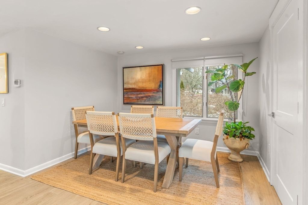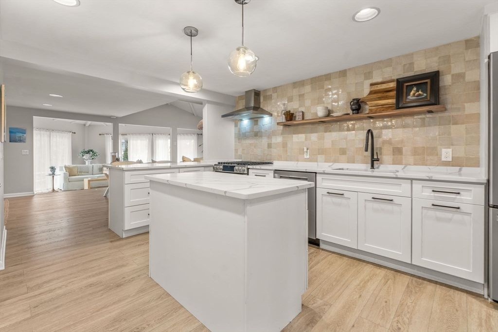 Don't miss out on this stunning, renovated coastal contemporary located in the desirable Village of Bright Coves—just a 1/2 mile walk to the beautiful sandy beach at The Popponesset Spit. This open-concept design features a spacious living room with a newly added gas fireplace surrounded by custom built-ins and shelving, flowing seamlessly into the dining area and a cozy sitting room with sliders opening to private outdoor decking and patio areas. The renovated, high-quality kitchen offers upgraded stainless steel appliances, a stylish tiled backsplash, pantry, center island, and breakfast bar with sleek quartz countertops. Enjoy easy one-level living with an added loft/bedroom upstairs and a convenient first-floor laundry closet off the hallway. Beautiful upgraded vinyl flooring throughout. Check out all of the New & close proximity to the Mashpee Commons. The primary suite includes a renovated bath and a custom California Closet system complete with built-in jewelry drawer.
